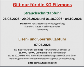 Immer wieder kommt es vor, dass Restmüll fälschlich zur Sperrmüllsammlung gebracht wird. Bitte beachten Sie: Nicht die Menge, sondern die Größe entscheidet! Restmüll gehört nur in die schwarze Tonne. Dazu zählen unter anderem Kinderspielzeug, Schläuche, Staubsaugerbeutel, Glühbirnen oder Zahnbürsten. Sollte kurzfristig mehr Restmüll anfallen, können im Gemeindeamt schwarze Restmüllsäcke gekauft werden, die mit der regulären Restmüllsammlung abgegeben werden.
